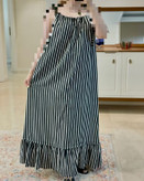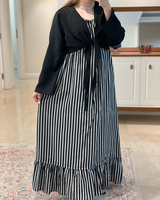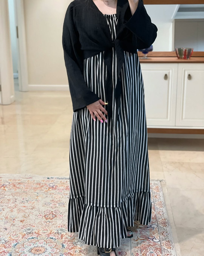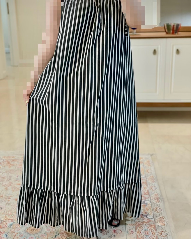 پیراهن راه راه سفید و مشکی __________________________ پیراهن با بند بلند قابل تنظیم پارچه خنک و سبک و راحت بدن نما نیست و آستر خورده زیر کار یه رویه مشکی خنک هم داره که میتونین باهاش ست کنین سایز آزاد و فری سایز قد ۱۴۰