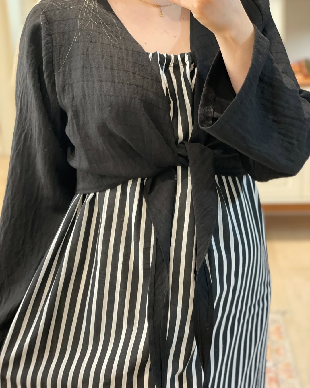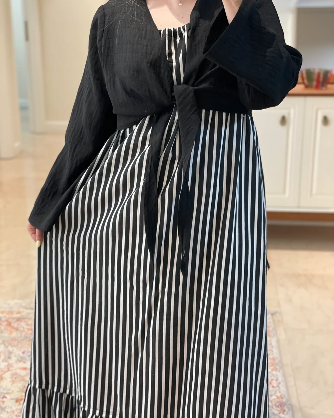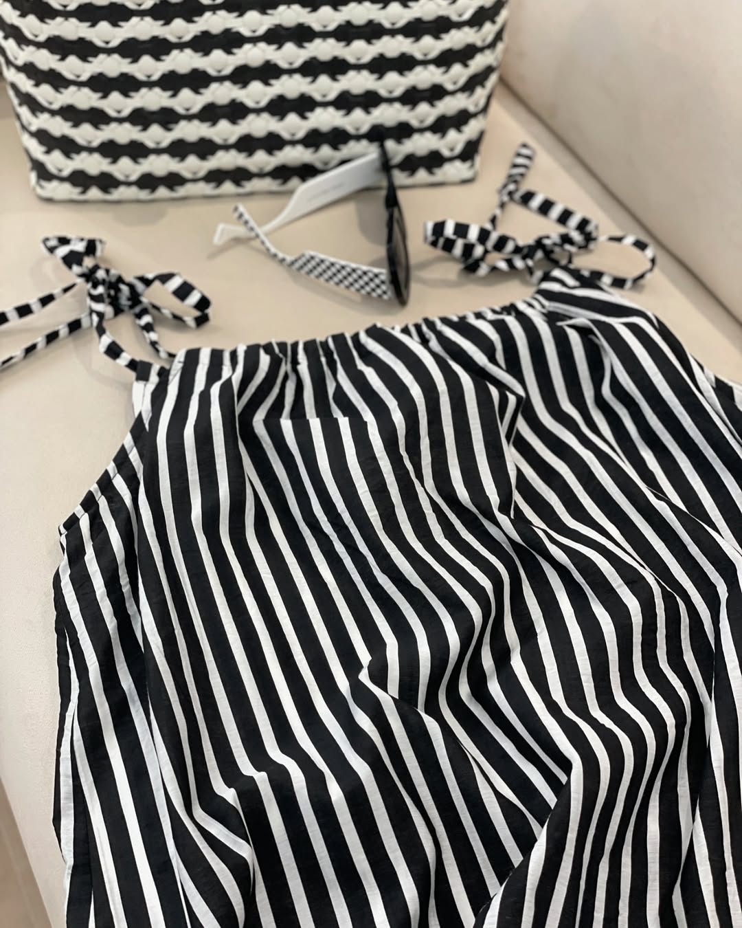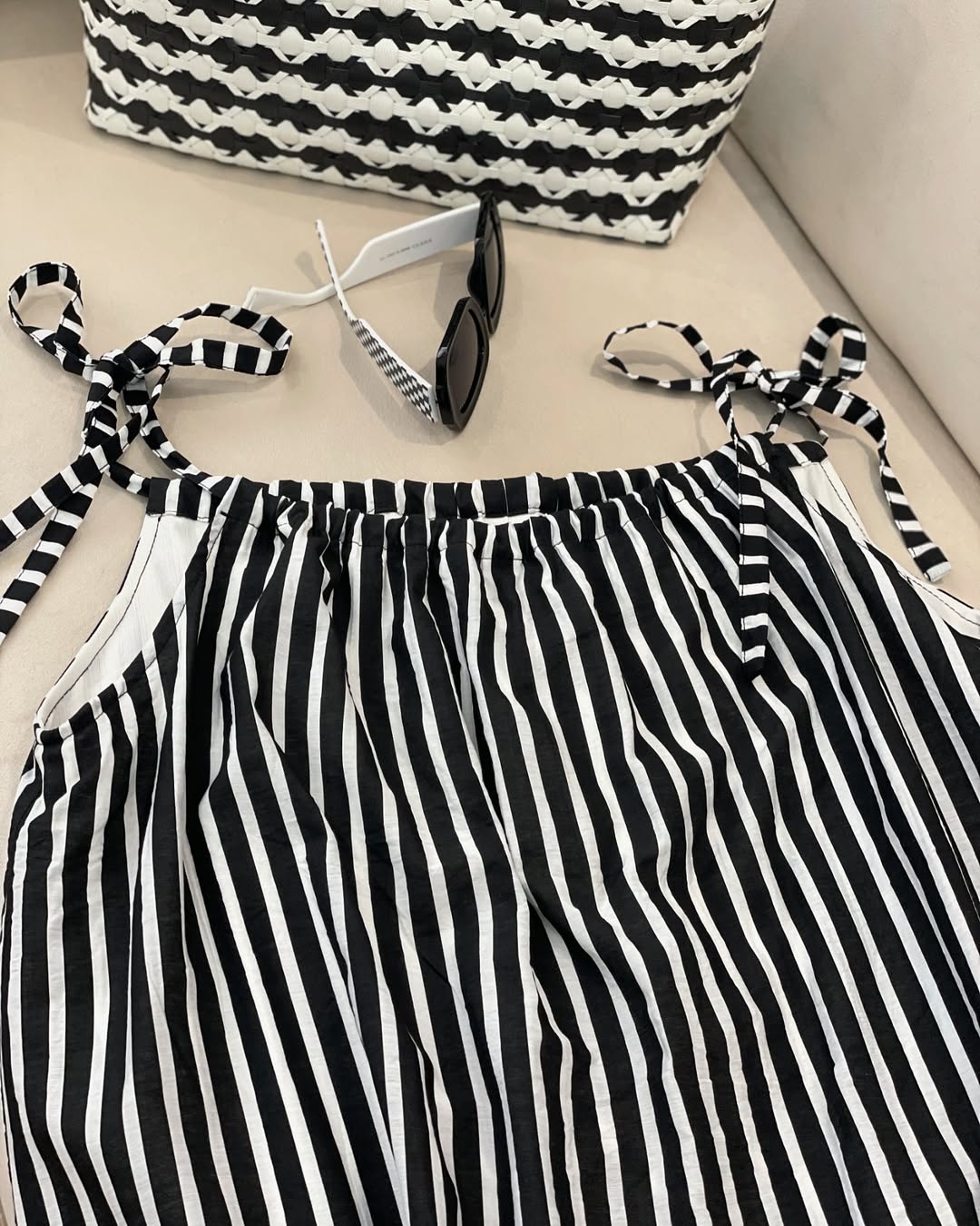پیراهن راه راه سفید و مشکی __________________________ پیراهن با بند بلند قابل تنظیم پارچه خنک و سبک و راحت بدن نما نیست و آستر خورده زیر کار یه رویه مشکی خنک هم داره که میتونین باهاش ست کنین سایز آزاد و فری سایز قد ۱۴۰